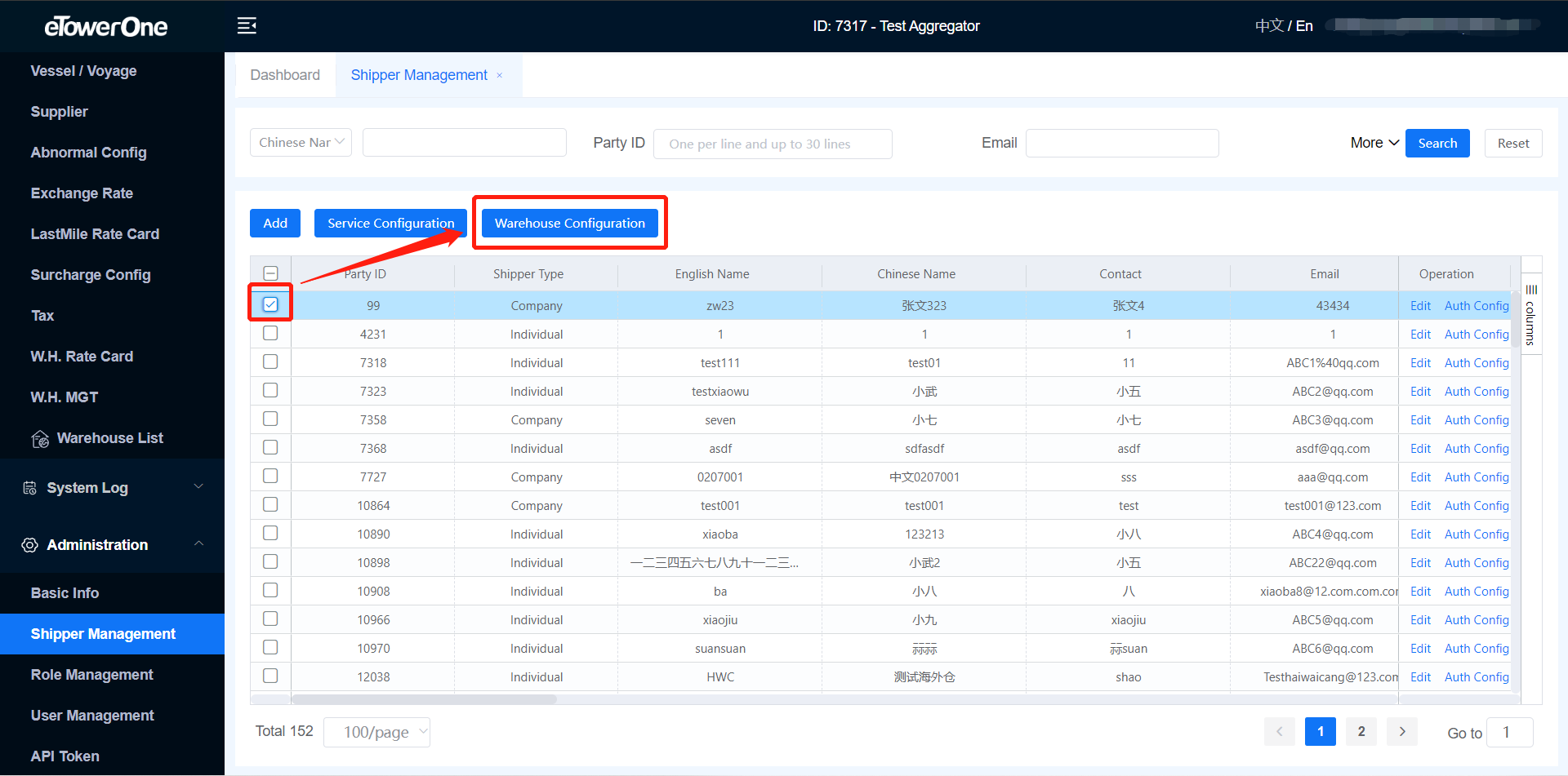 3.2 Warehouse: Select a shipper, then click 'Warehouse Configuration'.