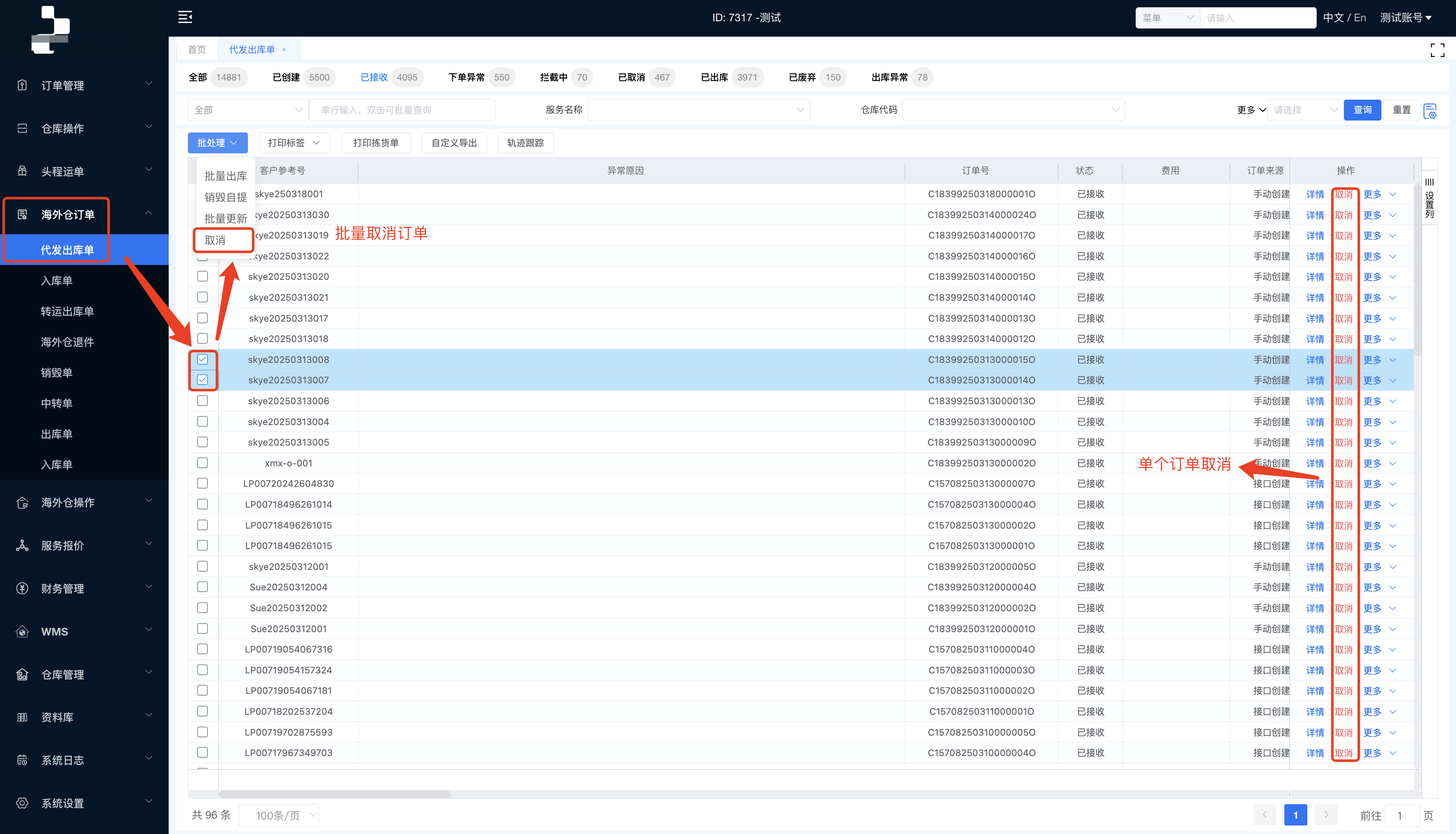 注意:“已接收”、“出库异常”的订单才支持进行取消操作,实际能否取消成功,以仓库的处理结果为准。