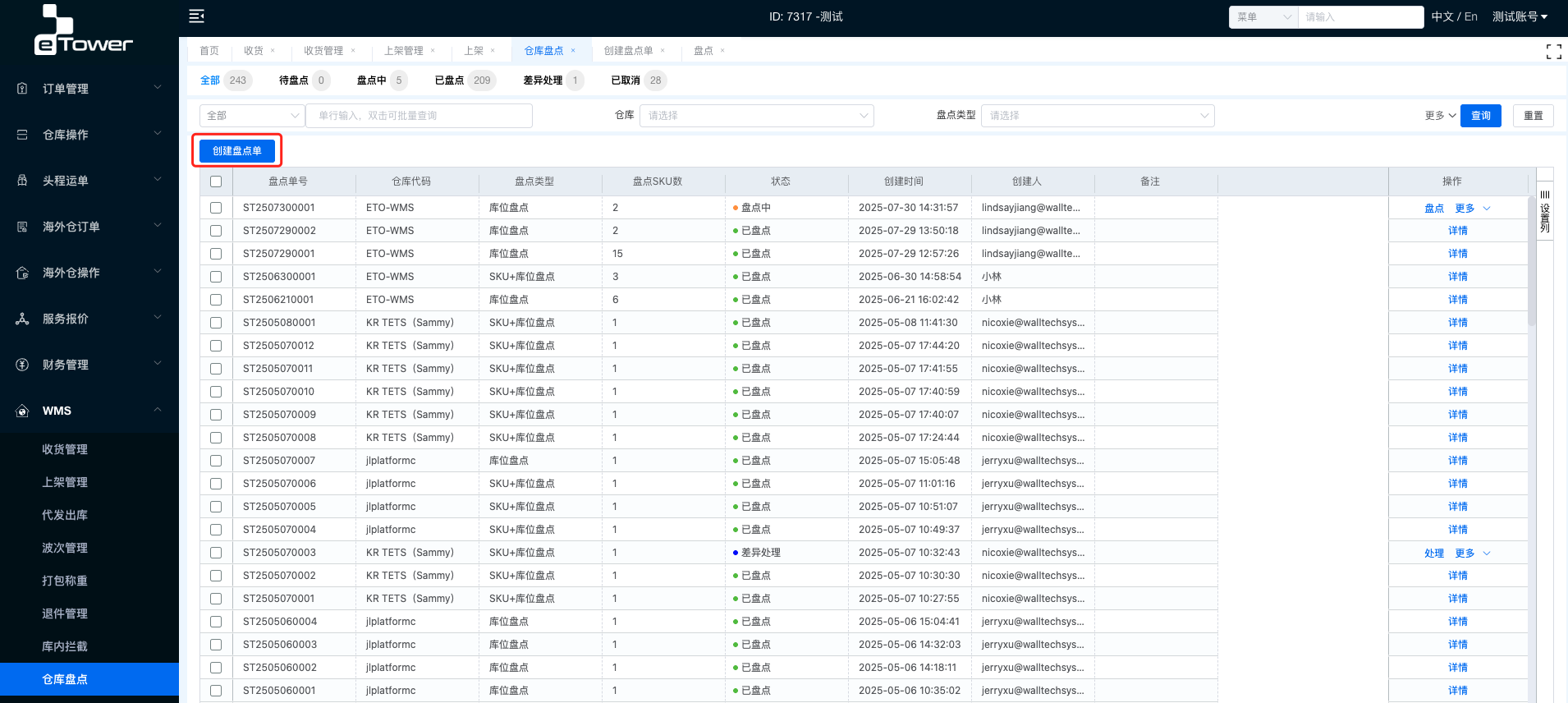 • 点击【创建盘点单】按钮,进入盘点单创建页面