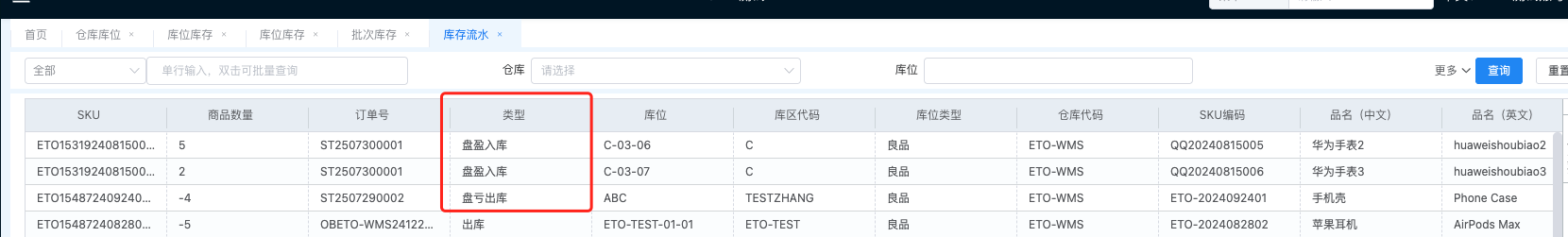 • 如为入库库存流水,则查询该库位中同SKUID的最晚入库流水,找到该记录的字段”创建时间“值记录至新增条目中,如未查到对应数据,则记录创建时间为当前时间