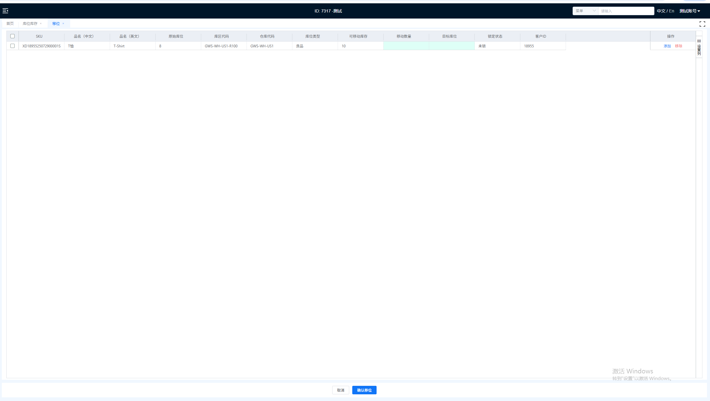 - 添加:点击“添加”,将所在行在下面添加一行,SKU、品名等信息一致,移位数量和目标库位字段为空