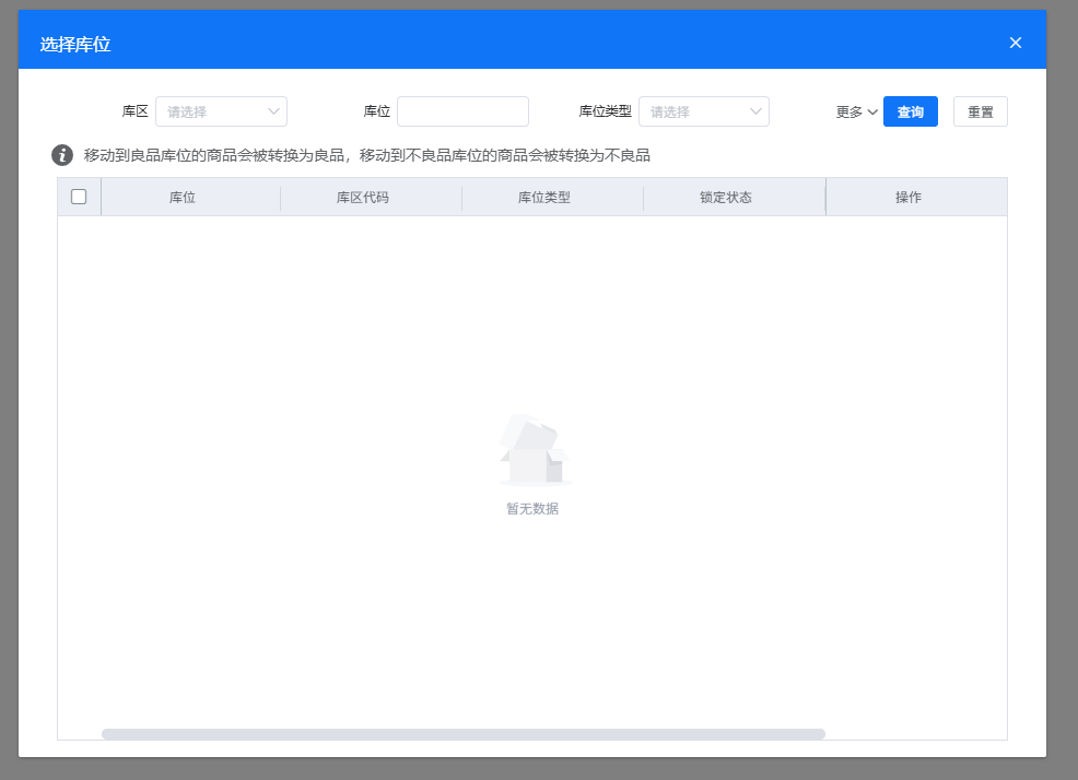 - 库区:下拉框,取值为移位页面对应库位所在仓库的下面所有库区