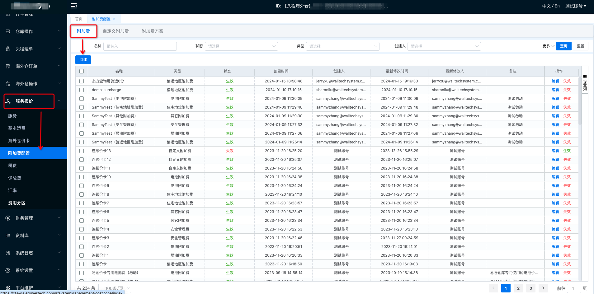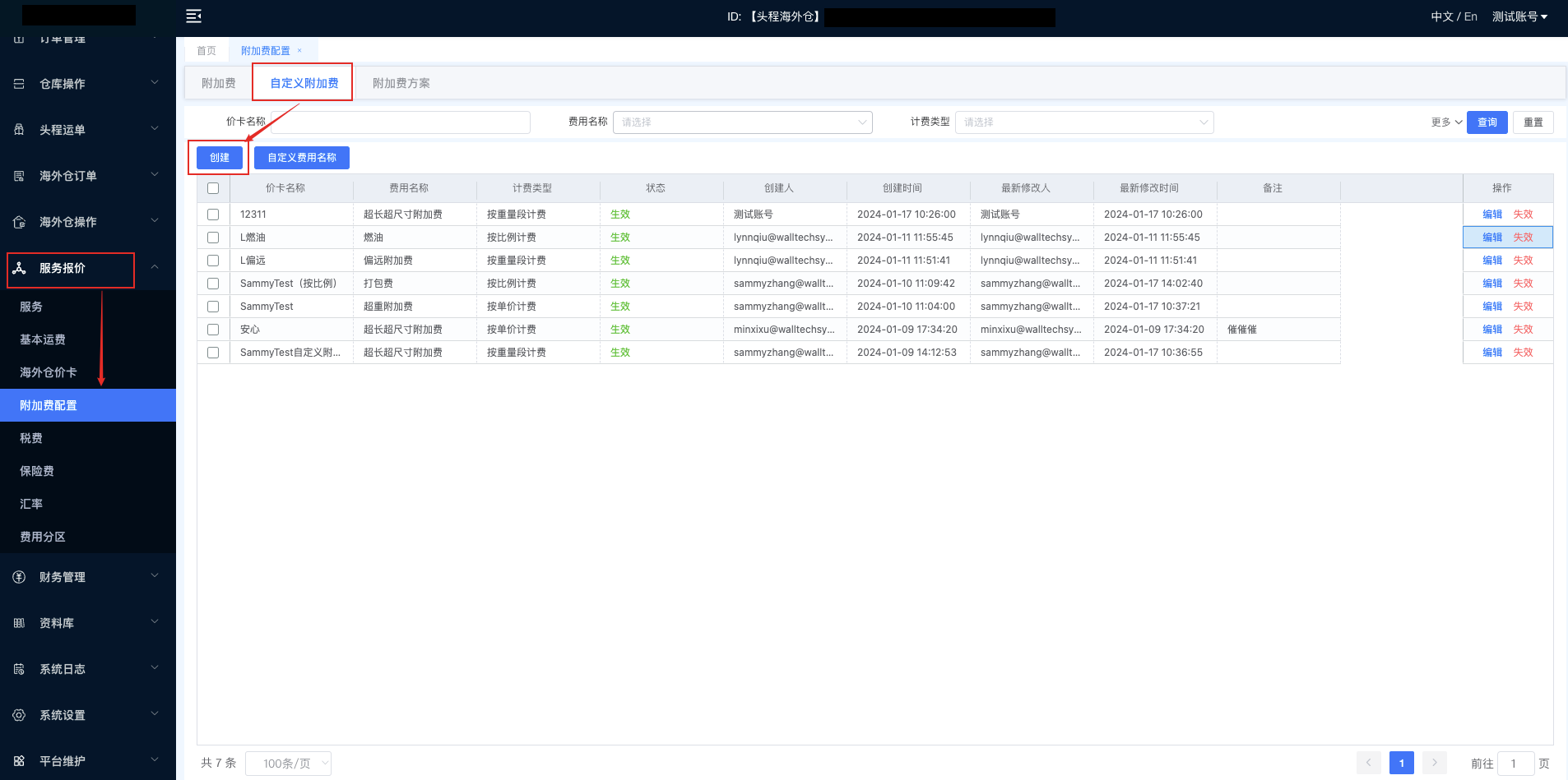 创建成功的附加费将展示在列表中,可进行编辑、生效/失效的设置