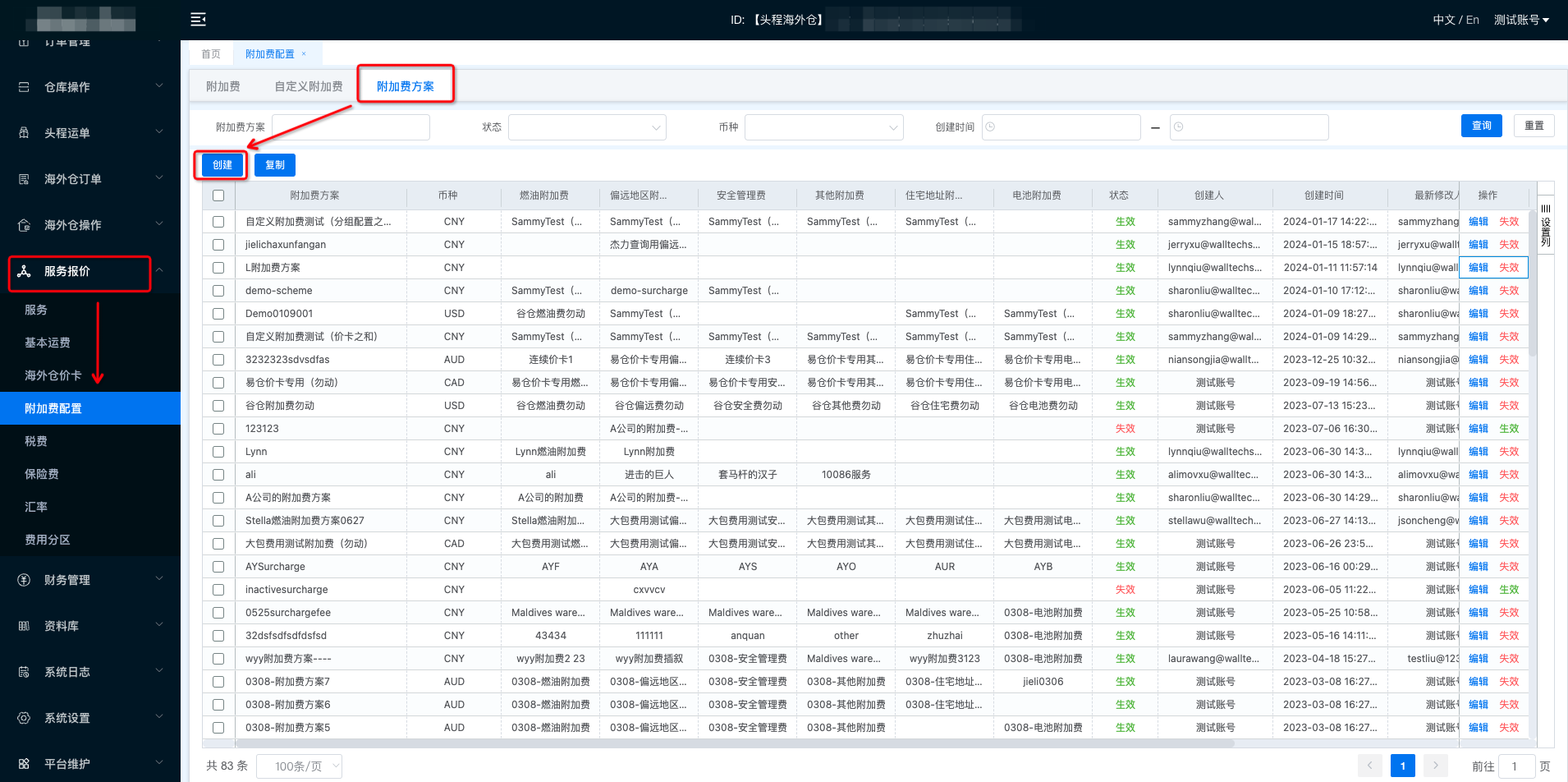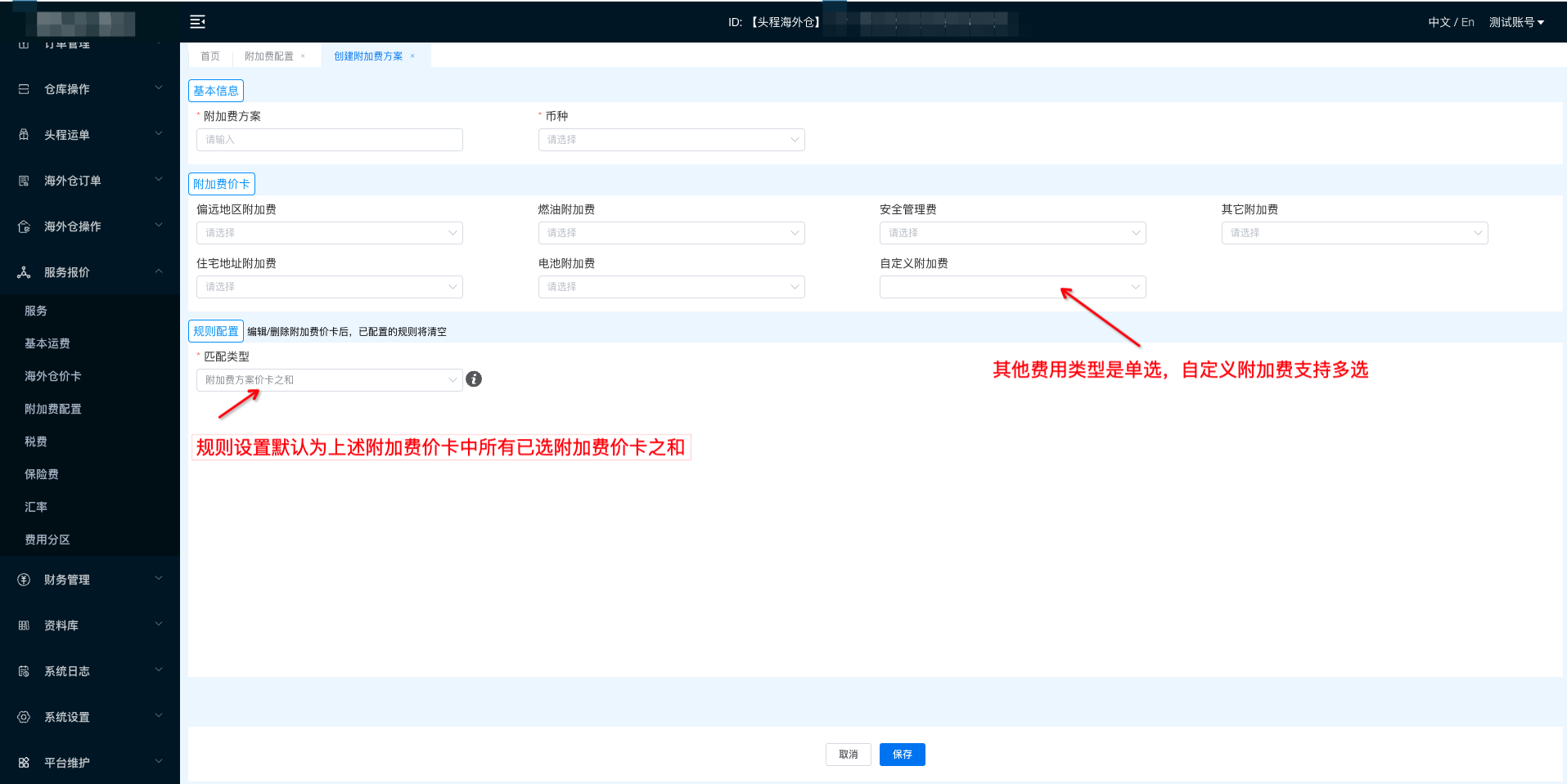 在附加费方案页面中点击创建,在页面中维护附加费方案(固定附加费可单选一个,自定义附加费可多选),可以理解为将已经设置好的附加费组成一个附加费的组合方案,最终配置到尾程渠道上是配置附加费方案