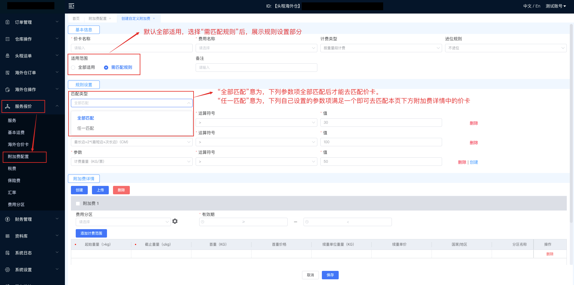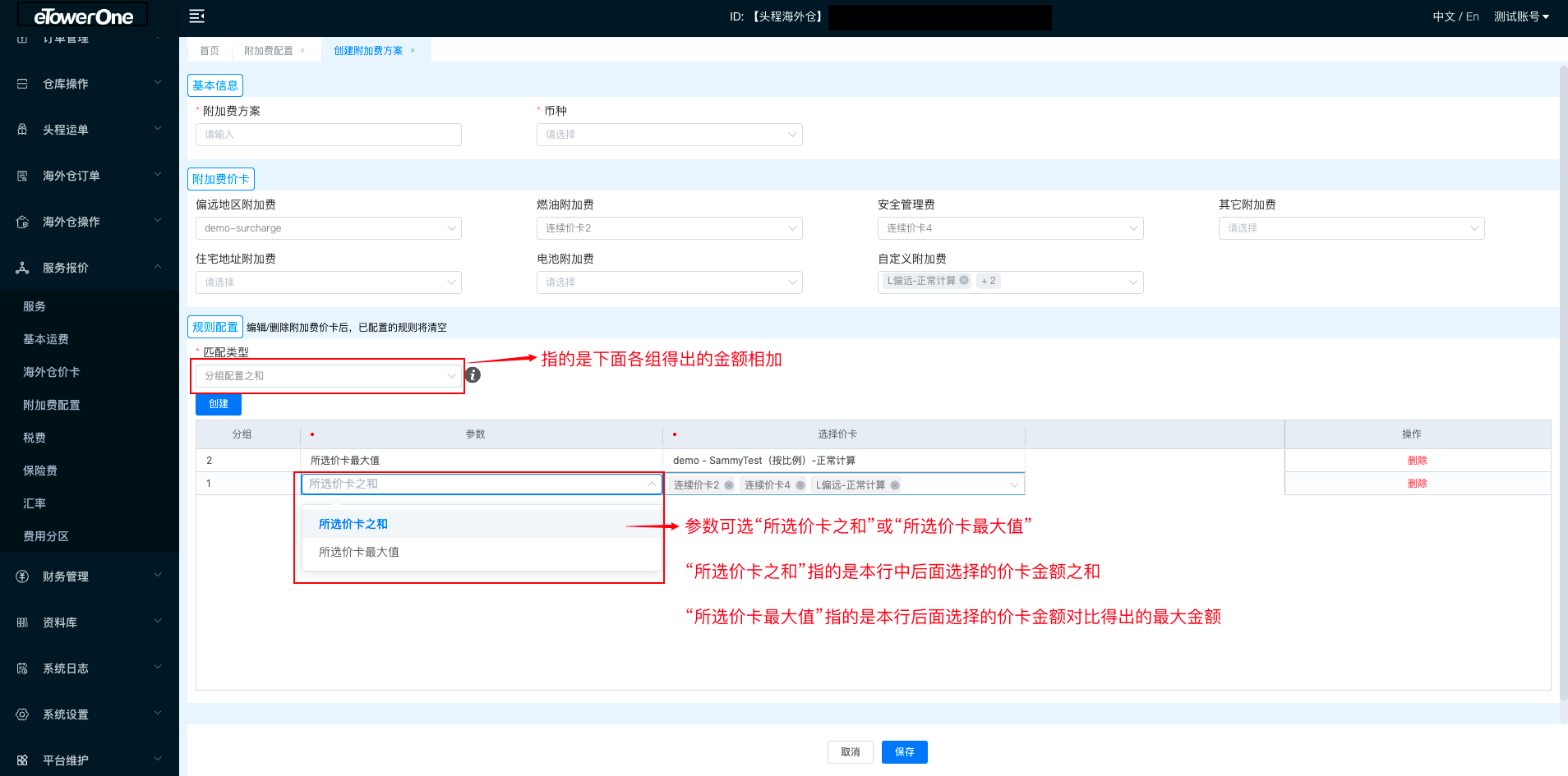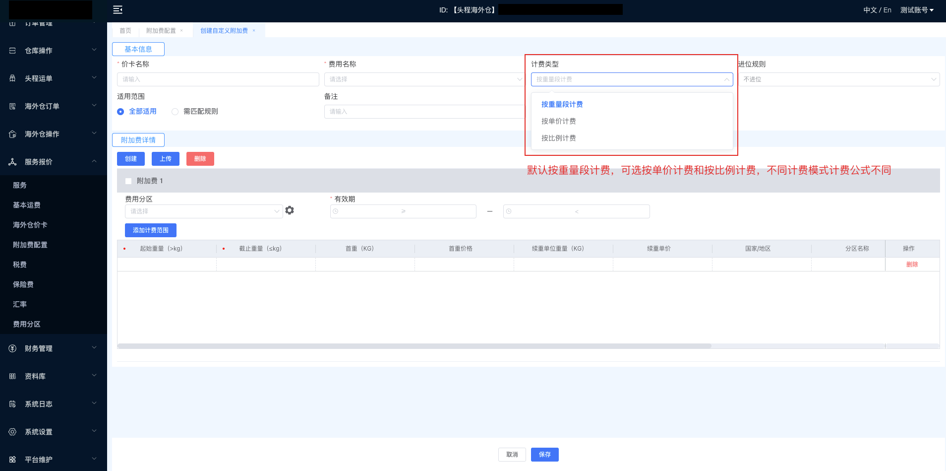在新页面中选择附加费类型并且设置对应的计算公式,计算公式的说明可参考页面的提示,如下图红框部分: