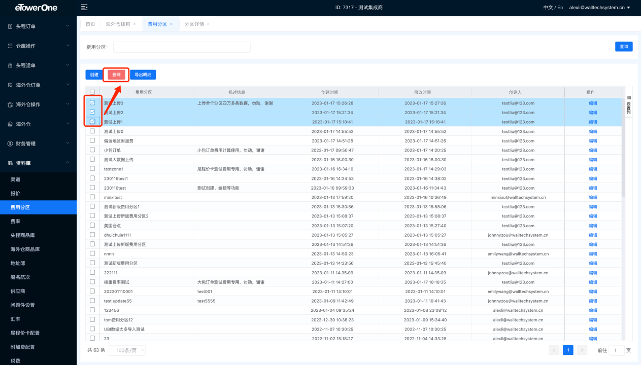 如需删除一级费用分区,勾选所要删除的数据(可多选),点击删除按钮即可