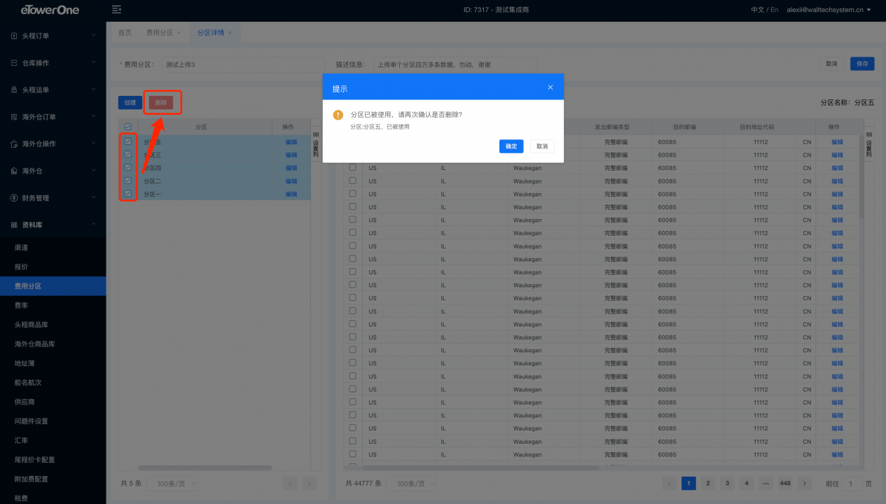 需注意:已经被使用的二级费用分区会提示被使用,可以选择继续删除或者放弃删除。如选择继续删除,则引用此分区的页面会清空此数据。比如如果有尾程价卡使用,删除二级费用分区后,尾程价卡中的分区会清空。