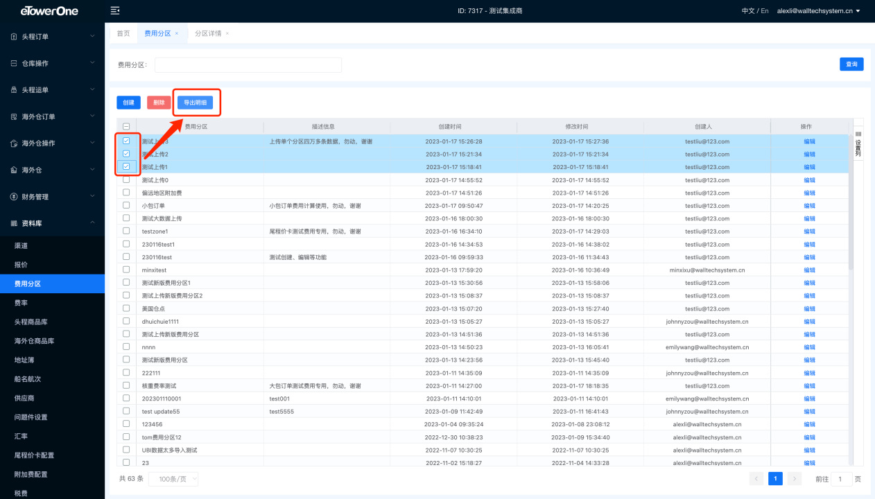 勾选所要导出的一级费用分区(可多选),点击导出明细按钮