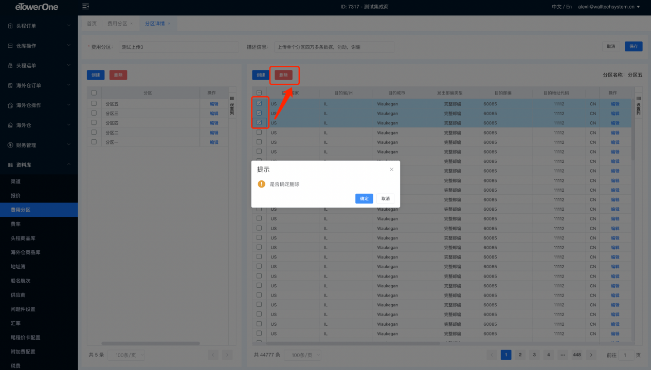 如需删除二级费用分区,勾选所要删除的数据(可多选),点击删除按钮即可
