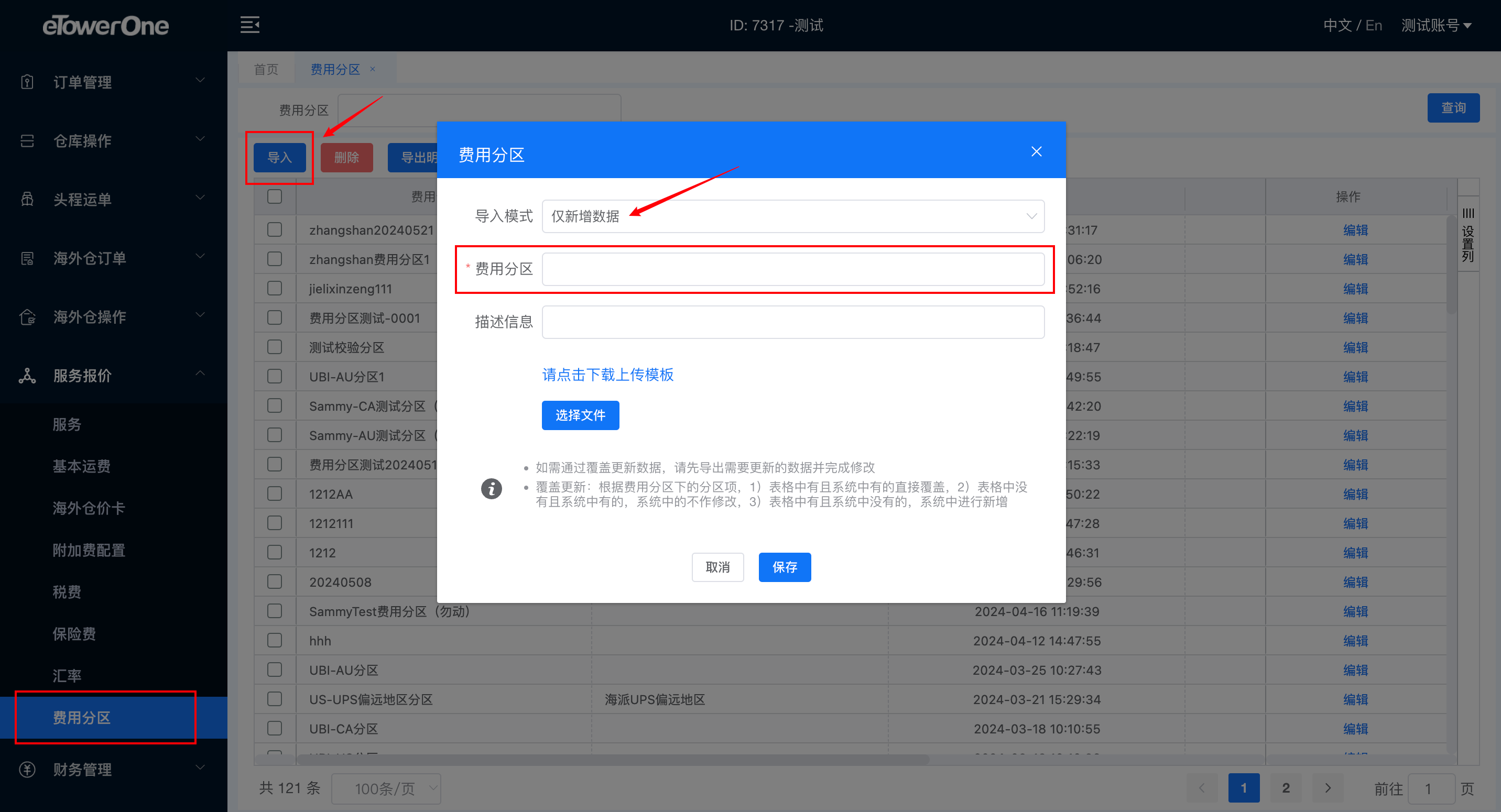 导入:表格上传费用分区